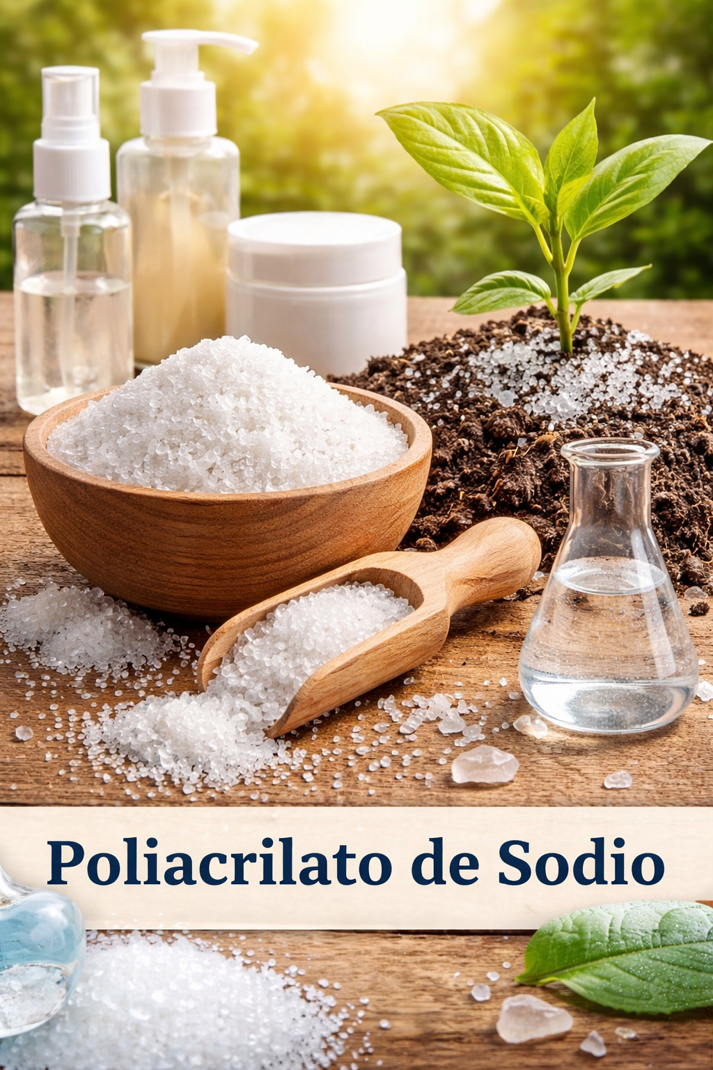 Polímero superabsorbente de alta capacidad de retención de agua, utilizado como espesante y estabilizante en formulaciones cosméticas e industriales. En agroindustria destaca por su capacidad de almacenar y liberar agua gradualmente en el suelo, mejorando la humedad disponible para las plantas, reduciendo la frecuencia de riego y aumentando la eficiencia hídrica en cultivos.